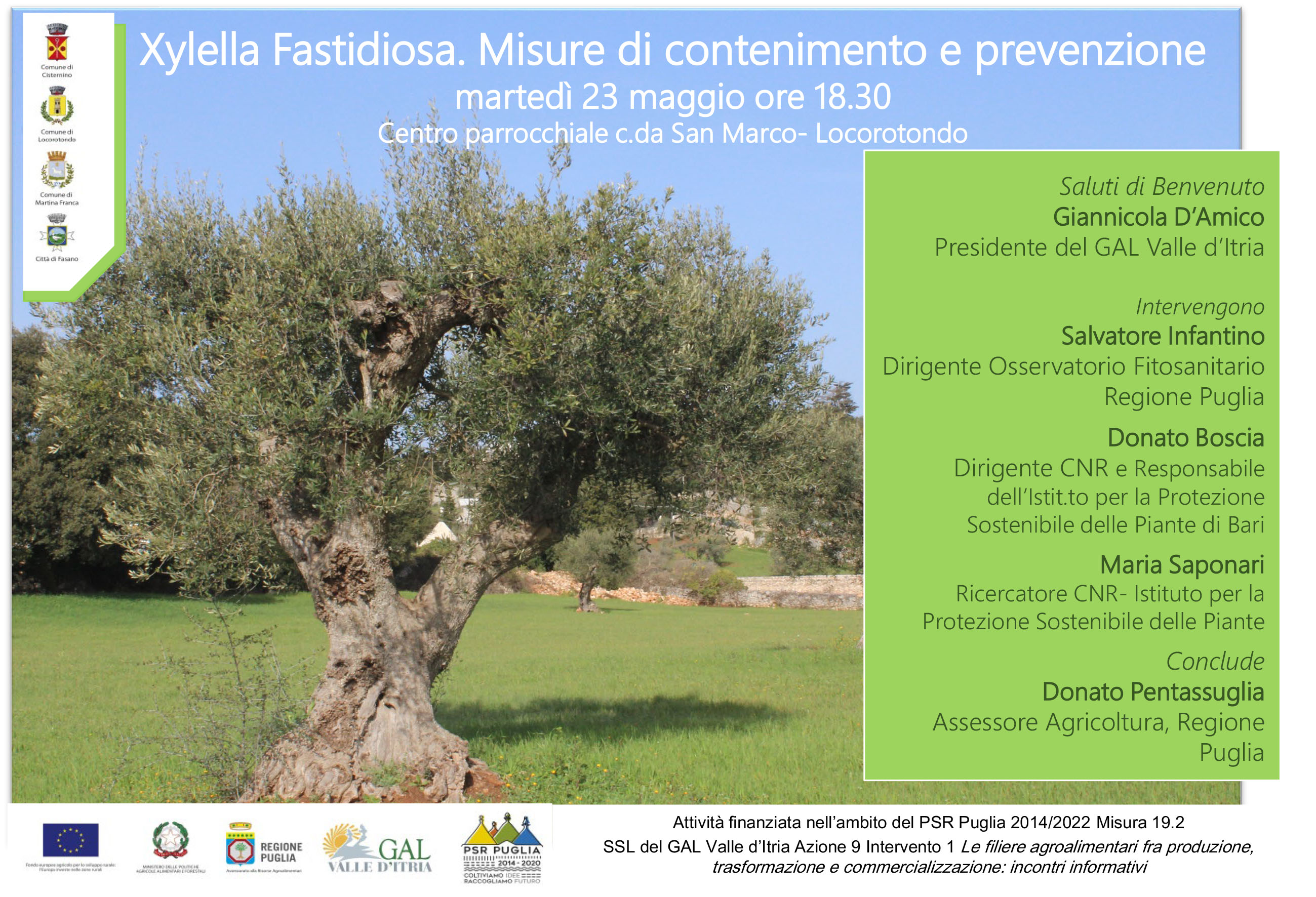 Si inizia con un Convegno disseminativo dedicato al tema della Xylella Fastidiosa e alle misure di contenimento e contrasto del batterio. L'incontro si terrà a partire dalle ore 18.30 presso il Centro parrocchiale in contrada San Marco a Locorotondo.