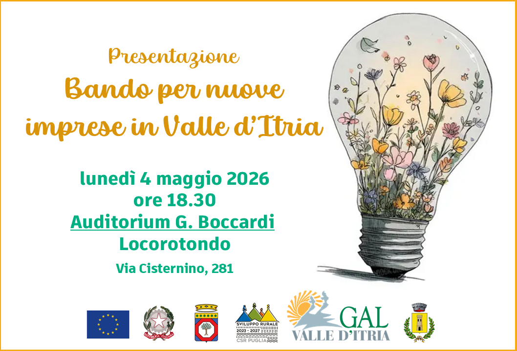 Il GAL Valle d'Itria dà avvio al ciclo di incontri dedicati alla presentazione dell'avviso pubblico destinato alla creazione di nuove imprese extra agricole nel territorio dei quattro comuni di Cisternino, Fasano, Locorotondo e Martina Franca.
